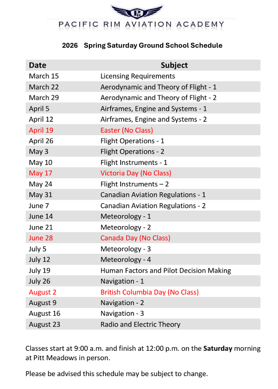 A comprehensive and engaging ground school is an integral part of any flight training program. Pacific Rim Aviation Academy provides quality ground school training for Private Pilot licenses, Commercial Pilot Licenses, and other ratings. Ground school is taught in our classrooms at Pitt Meadows Airport (CYPK). Students can interact with our experienced instructors in a multimedia environment and we encourage dynamic class discussions to enhance the learning experience.